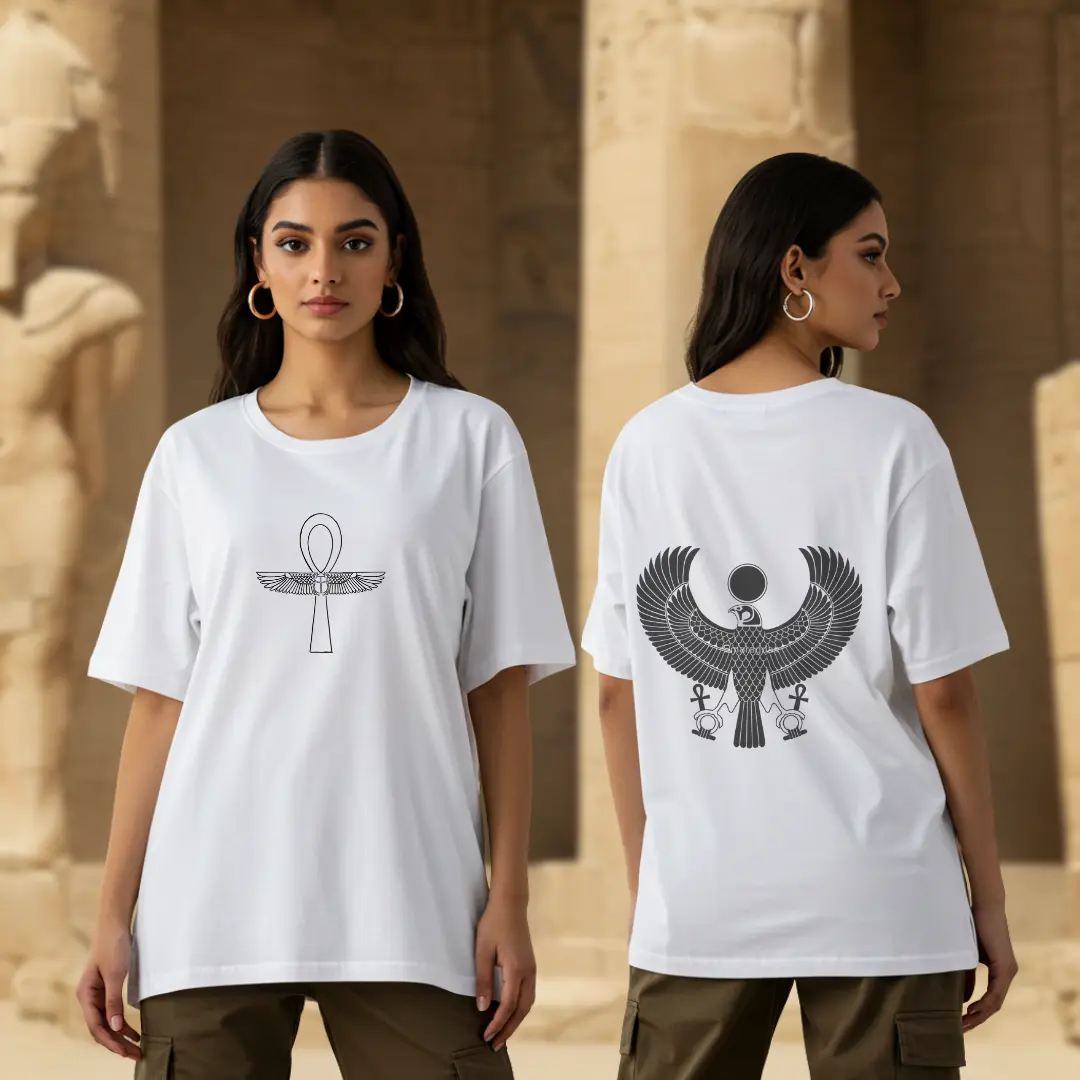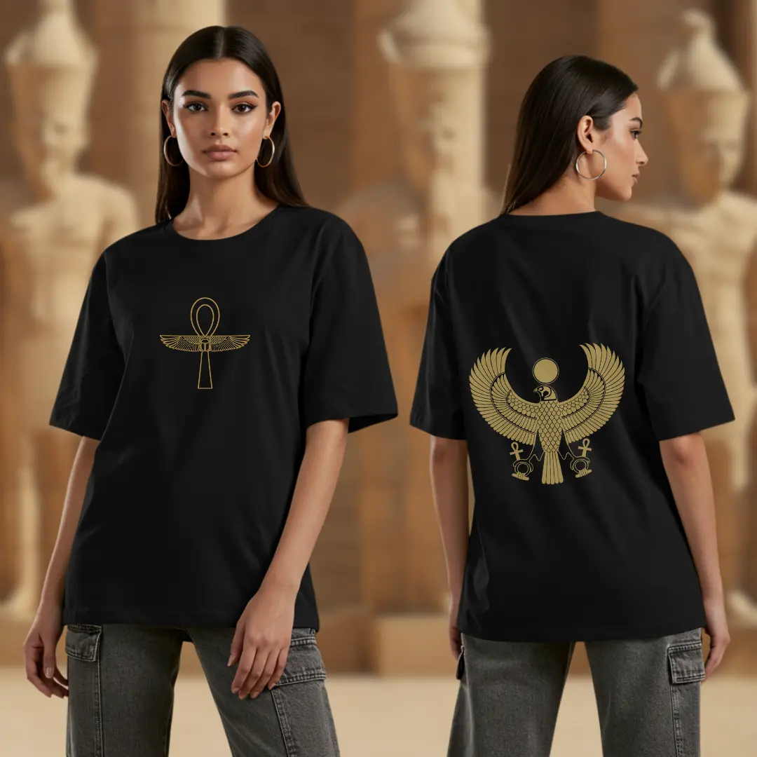 The Ankh Rebirth t-shirt celebrates divine femininity and ancient Egyptian heritage. Featuring a minimal Ankh with wings on the front — a symbol of life and protection — and a majestic winged goddess print on the back, this tee radiates ancient royalty with a modern edge.