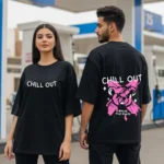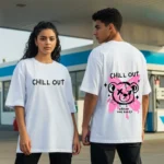 It looks like calm, but it walks like rebellion. This “Chill Out” tee brings together irony, attitude, and just enough edge to keep things interesting. The front keeps it minimal — bold black text in your face. But the back? A pink-splashed bear with an eye patch and a warning: Break the Rules. It’s not about chaos, it’s about contradiction — cool on the outside, fire underneath.