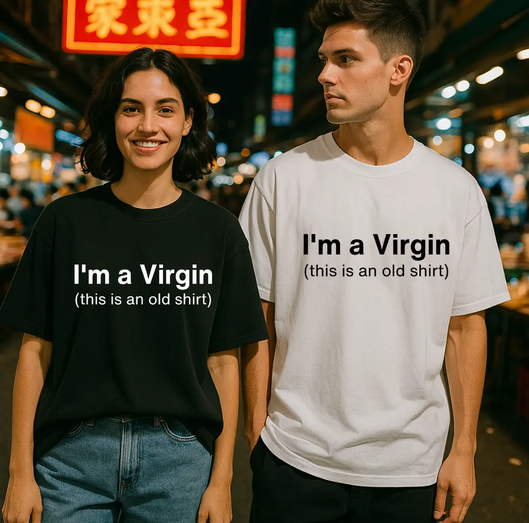 Add a bold twist to your casual wardrobe with this “I’m a Virgin (this is an old shirt)” graphic tee. Perfectly sarcastic, hilariously confusing, and effortlessly cool — this shirt is made for people who don’t take themselves too seriously.