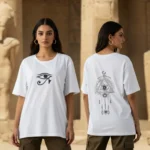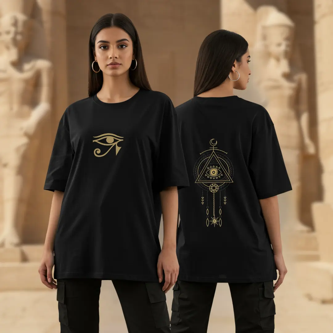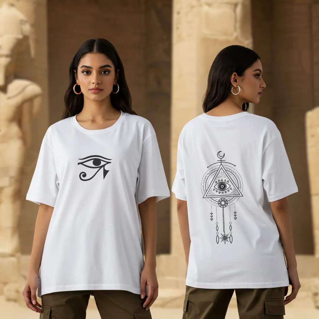 The Mystic Guardian tee is made for bold girls who walk with ancient wisdom and cosmic vibes. On the front, the Eye of Horus watches with protective energy — fierce, feminine, and full of mystique. On the back, a beautifully detailed sigil radiates lunar power and divine geometry.