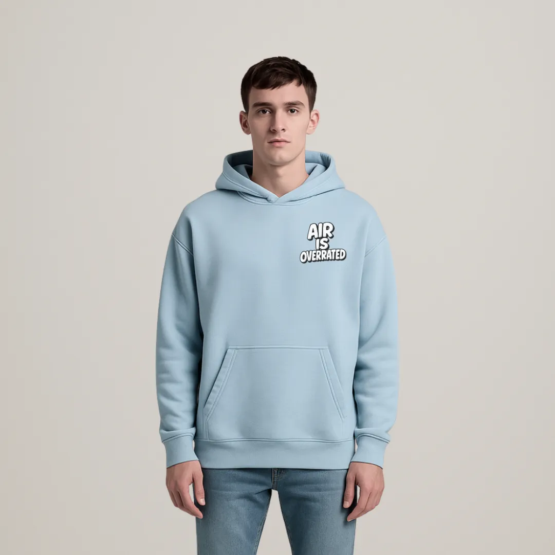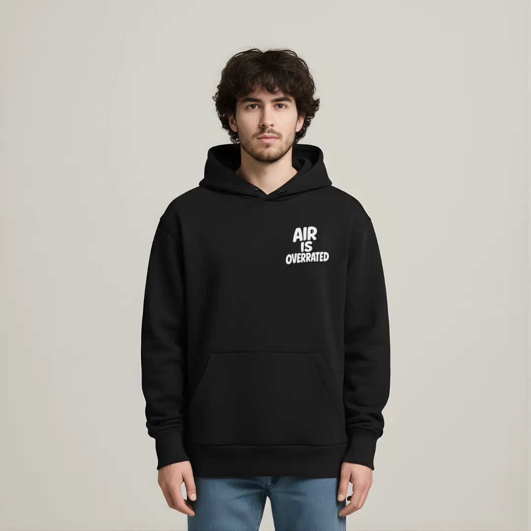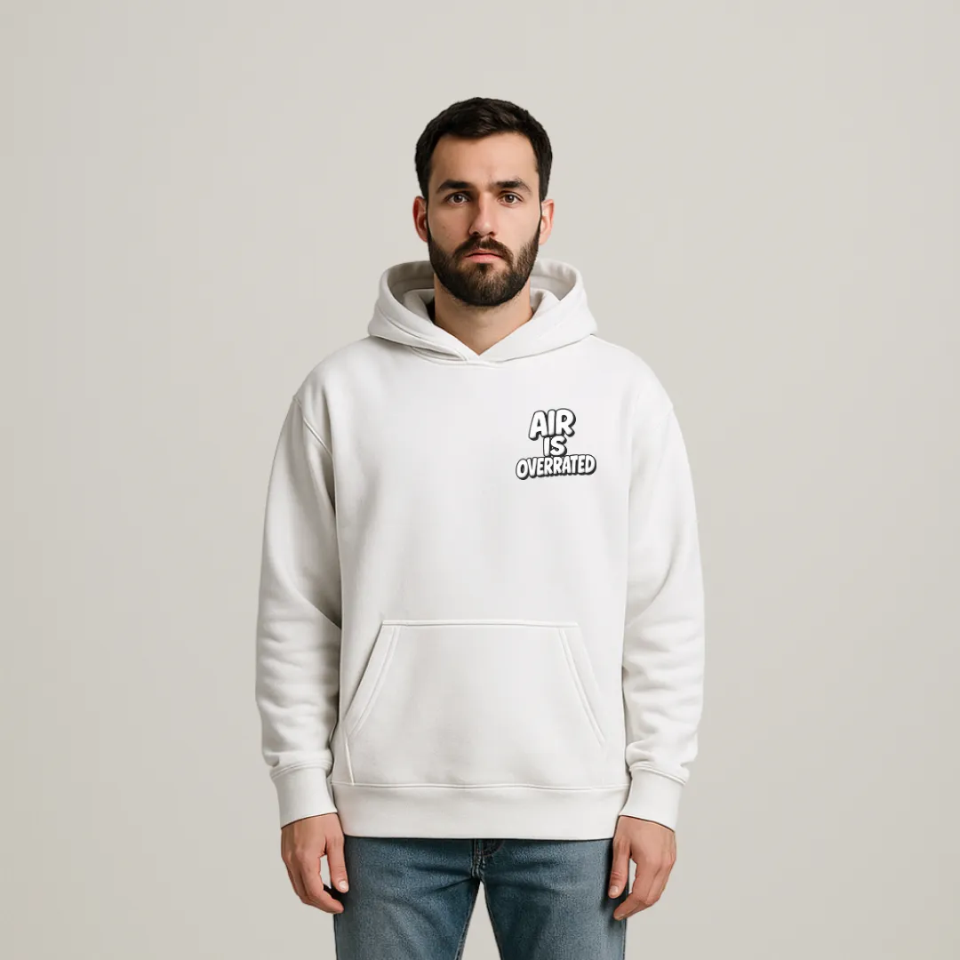 A playful oversized hoodie combining a bold “AIR IS OVERRATED” front print with a stylish illustrated bunny on the back, dressed in a suit and sunglasses for a cool, humorous vibe. Soft, comfortable, and perfect for streetwear lovers who enjoy fun and expressive designs.