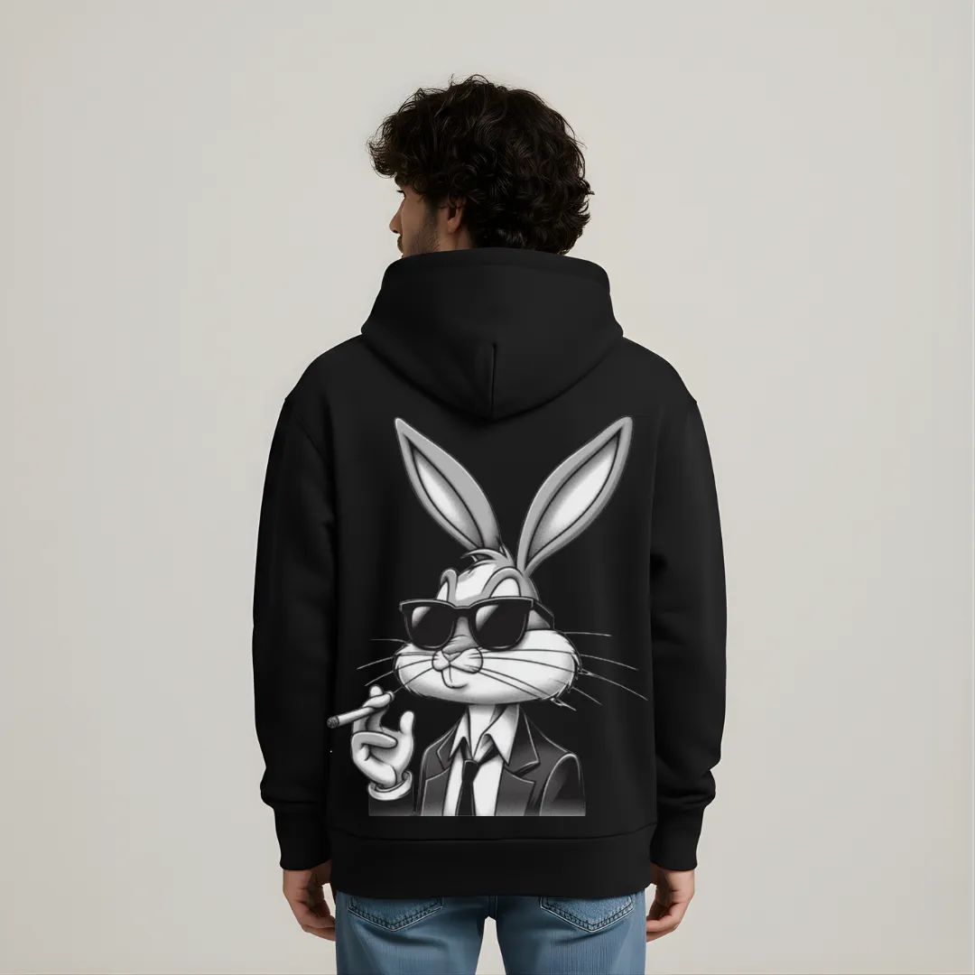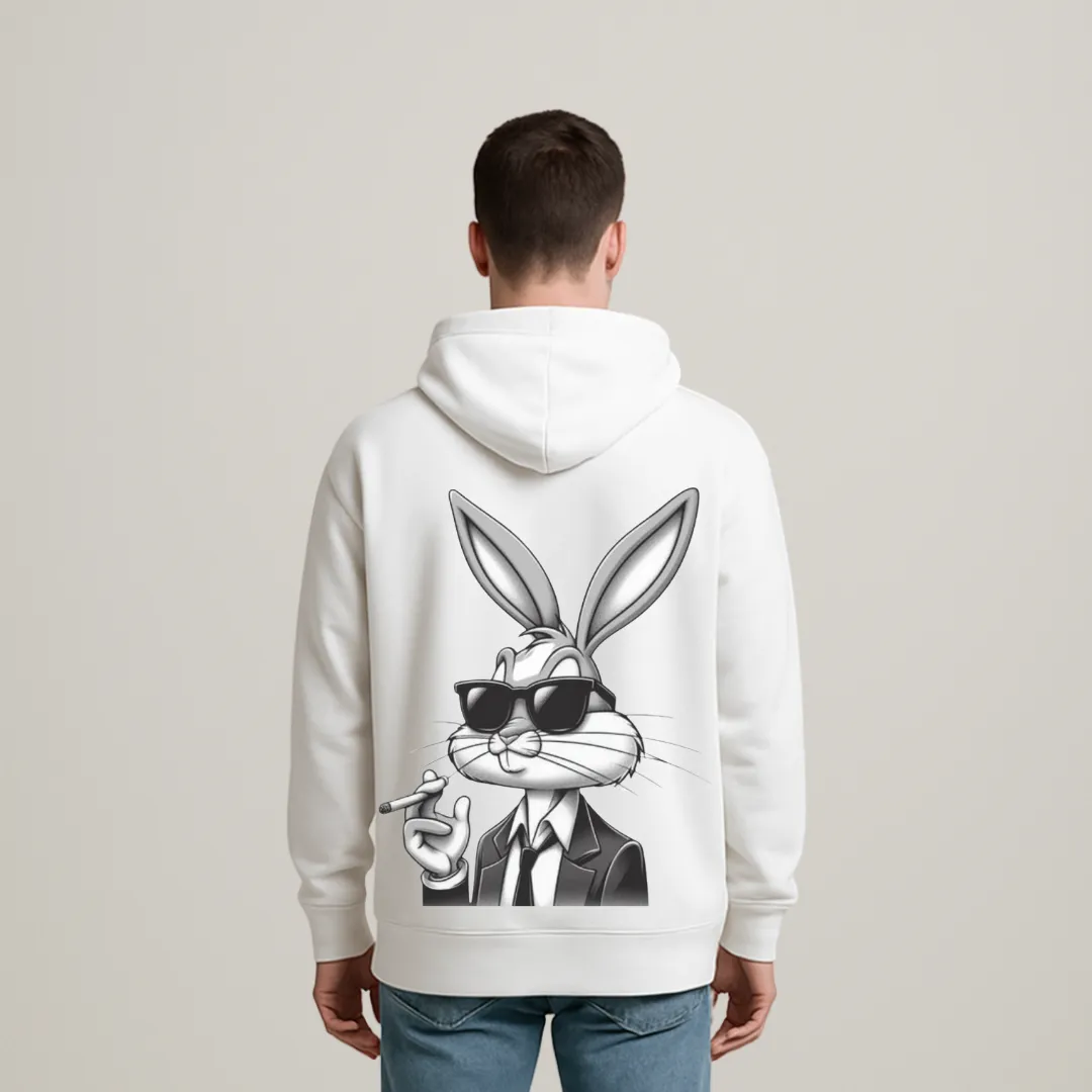 On the back, a sleek illustrated bunny — dressed in a suit, wearing sunglasses, and holding a cigarette — adds a bold street-style edge. The character’s confident expression and clean black-and-white drawing make the design both stylish and eye-catching.