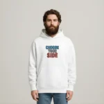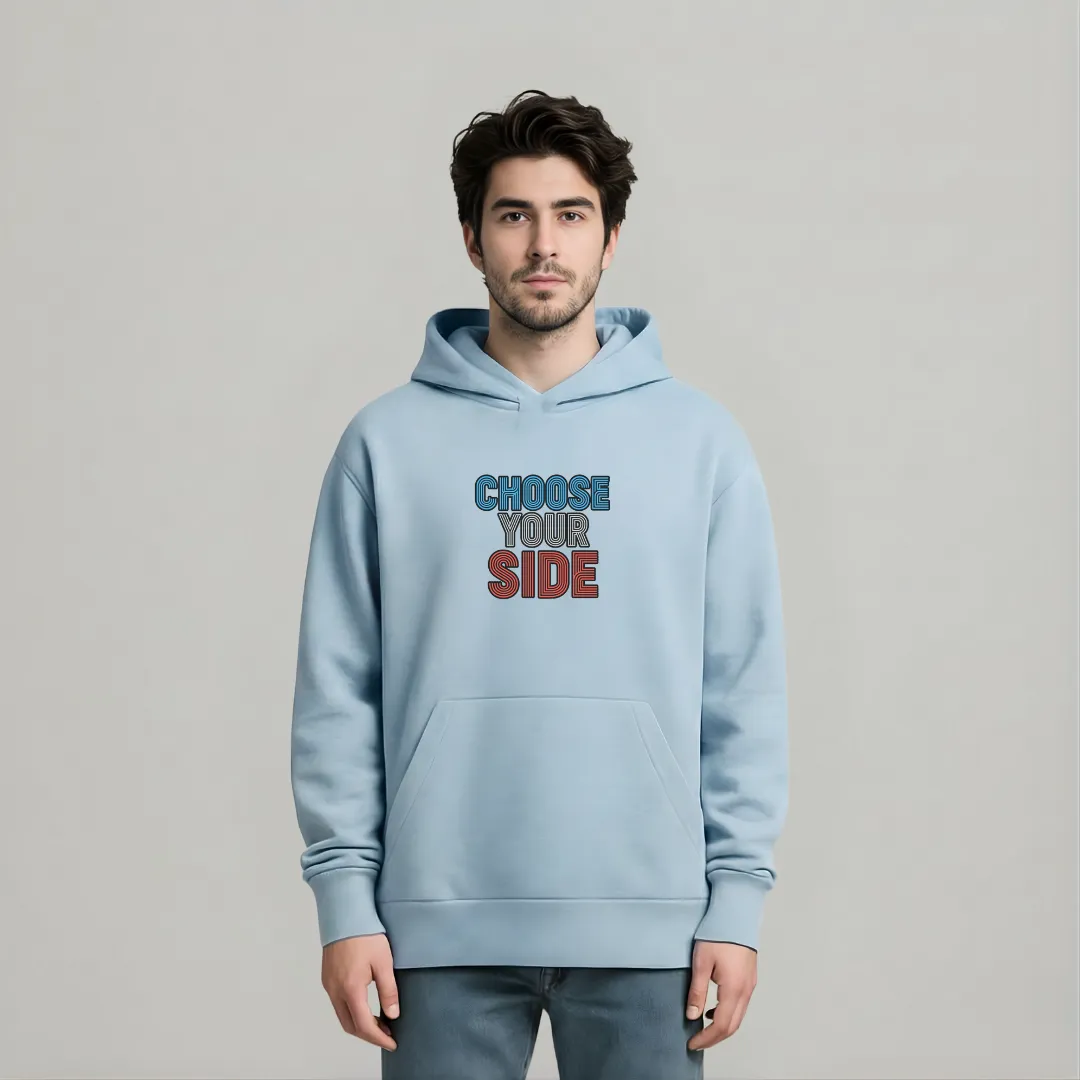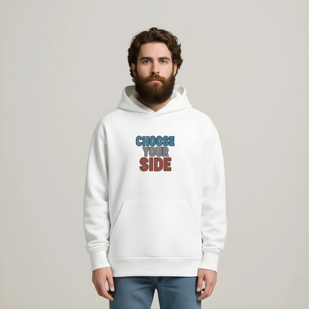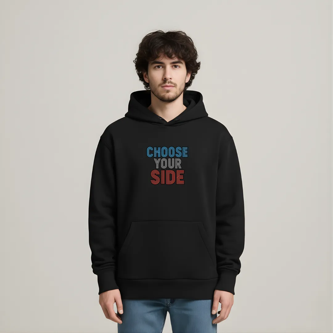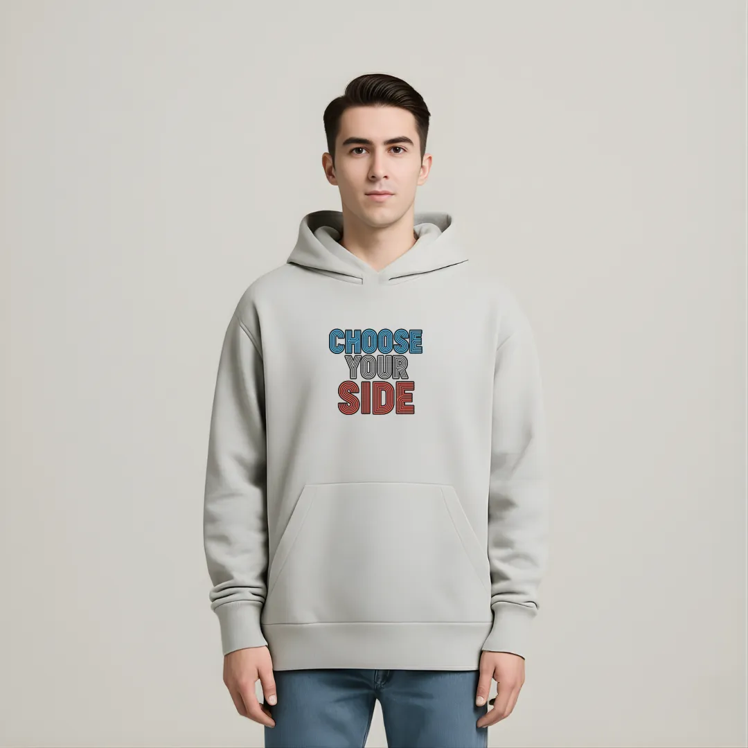 Oversized hoodie featuring the bold phrase “CHOOSE YOUR SIDE” on the front in dual-tone typography. The back showcases a striking split-face illustration representing the contrast between light and dark. Crafted for comfort with a relaxed fit and a front kangaroo pocket — perfect for everyday style.