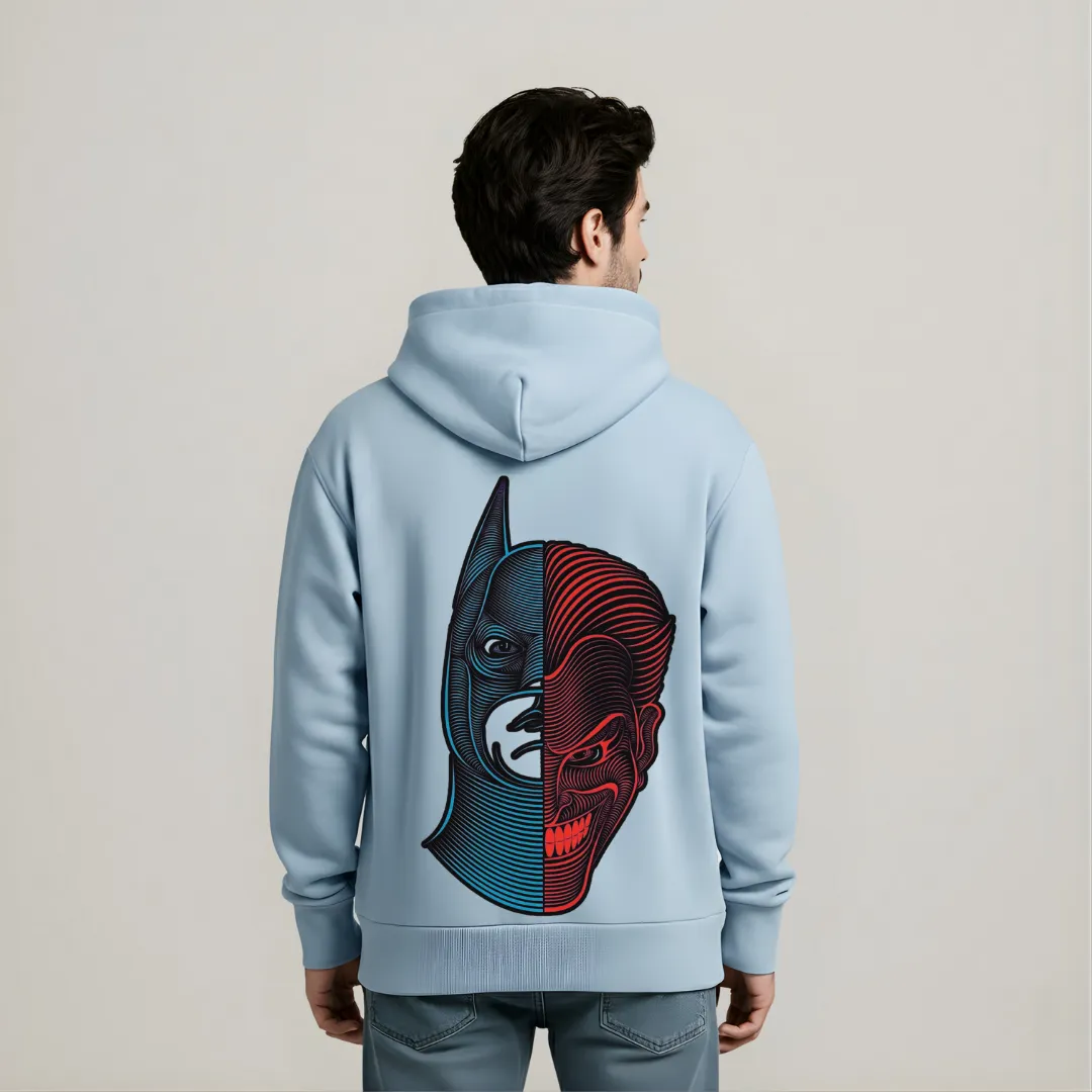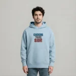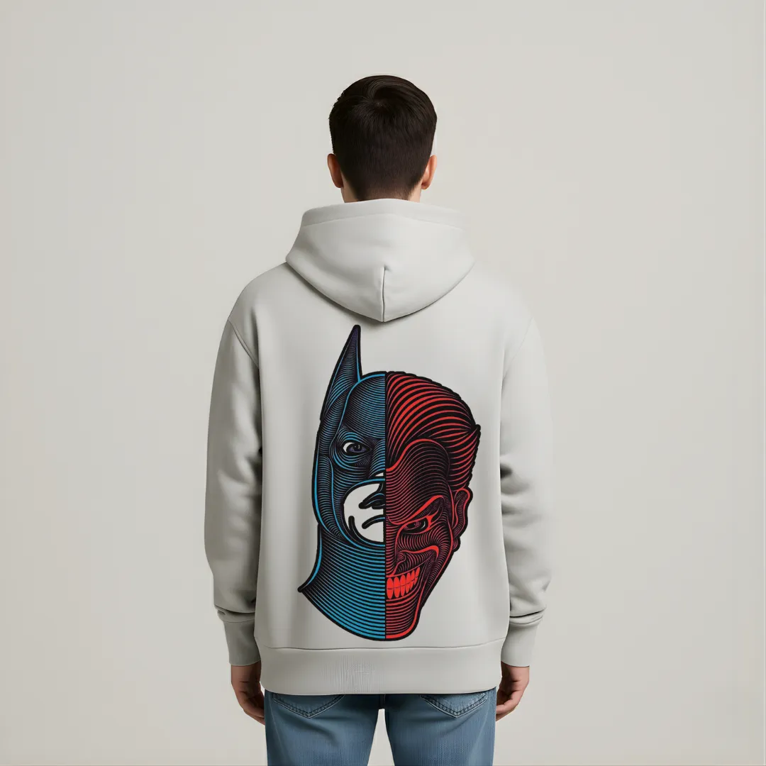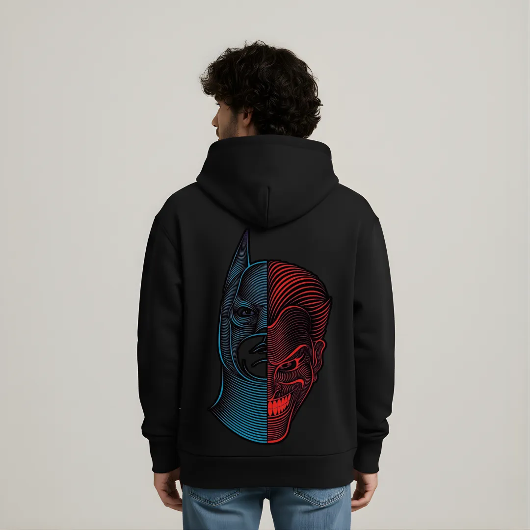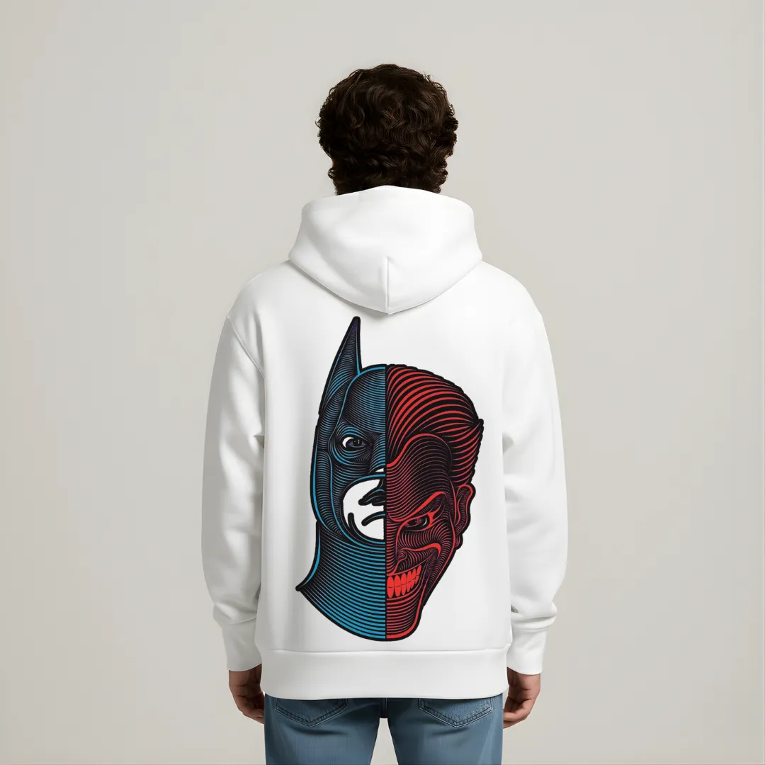 Oversized hoodie featuring the bold phrase “CHOOSE YOUR SIDE” on the front in dual-tone typography. The back showcases a striking split-face illustration representing the contrast between light and dark. Crafted for comfort with a relaxed fit and a front kangaroo pocket — perfect for everyday style.