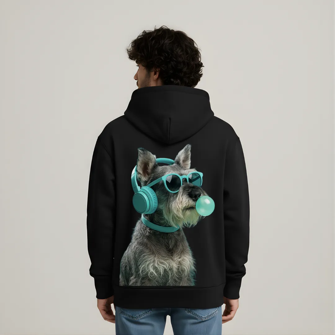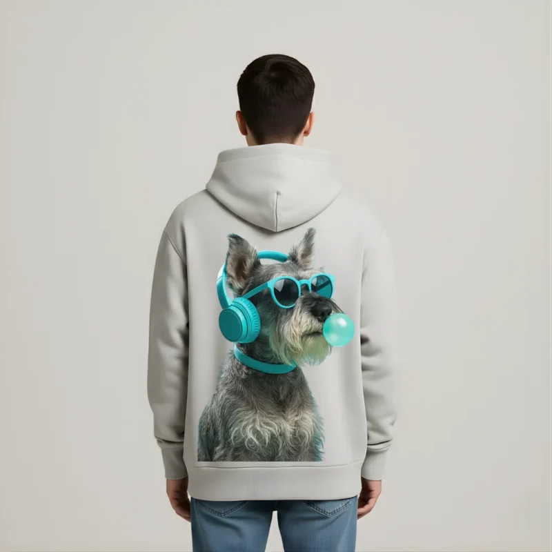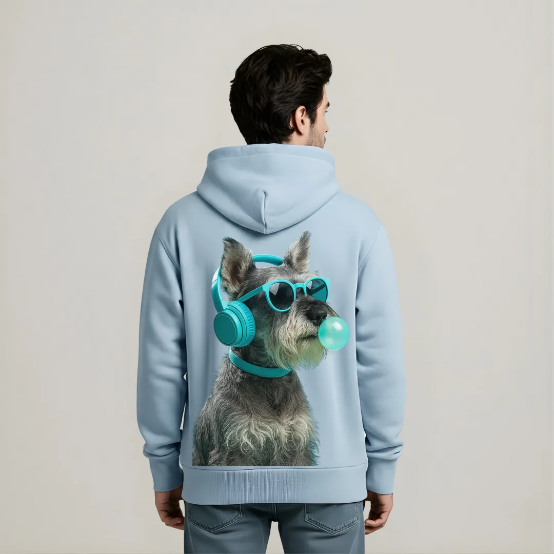 But the highlight is on the back: a cool dog wearing headphones, sunglasses, and blowing bubble gum — a bold, modern artwork that adds character and fun to the hoodie. The bright turquoise accents create a cohesive aesthetic that pops beautifully against the clean white fabric.