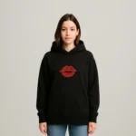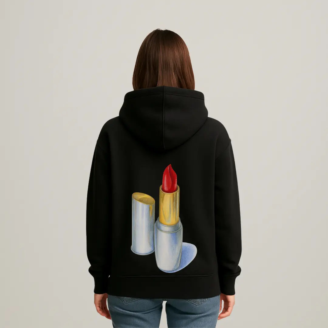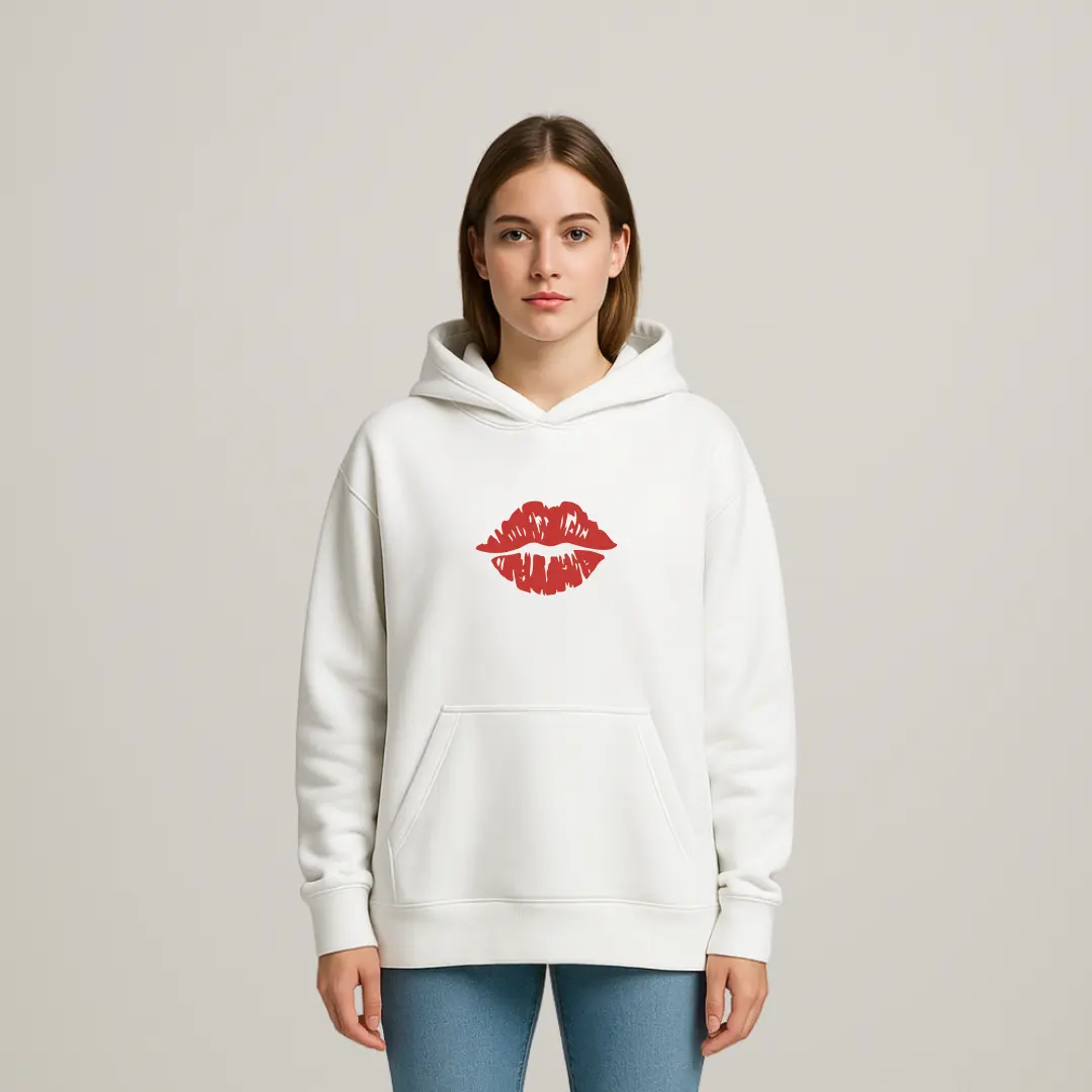 This hooded sweatshirt combines comfort and style with unique graphic prints. On the front, it showcases a bold red lipstick kiss mark right in the center of the chest, creating a playful and eye-catching detail. The back of the hoodie displays a detailed, realistic illustration of a red lipstick in a silver and gold tube, adding a fashionable and artistic touch. The hoodie has a classic fit with a front kangaroo pocket and ribbed cuffs, making it a cozy and trendy piece suitable for casual wear. The bright red accents stand out sharply against the clean white fabric, making this hoodie a statement item in any wardrobe.