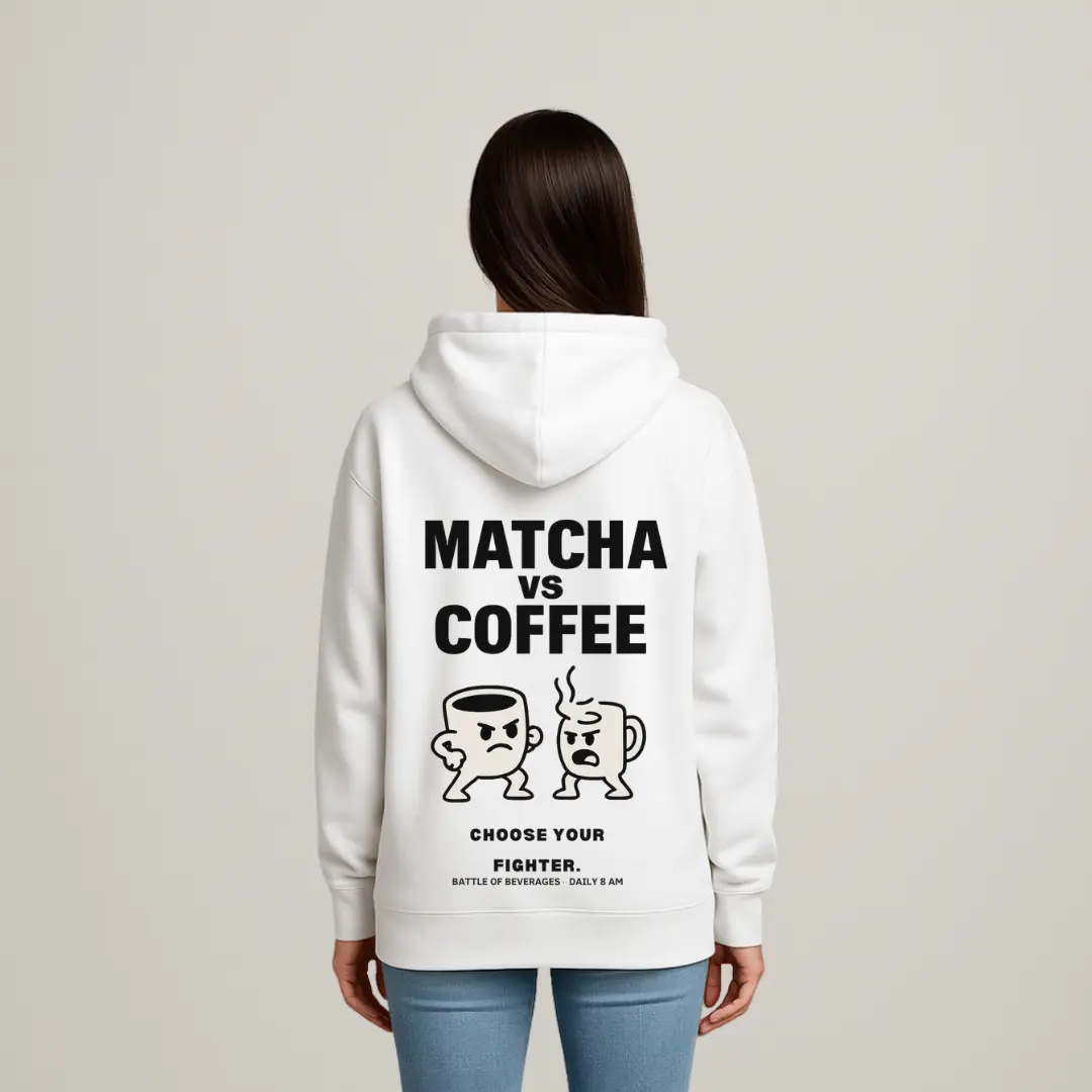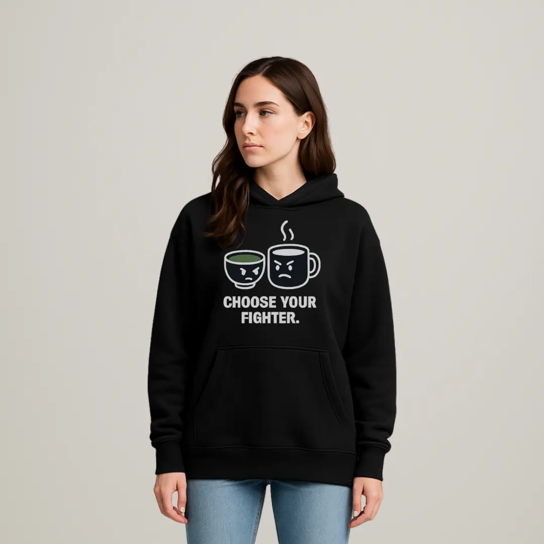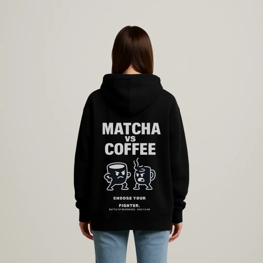 A stylish hoodie featuring a playful coffee versus matcha theme on the back and a coffee and matcha face-off on the front, with a humorous “Choose Your Fighter” slogan.