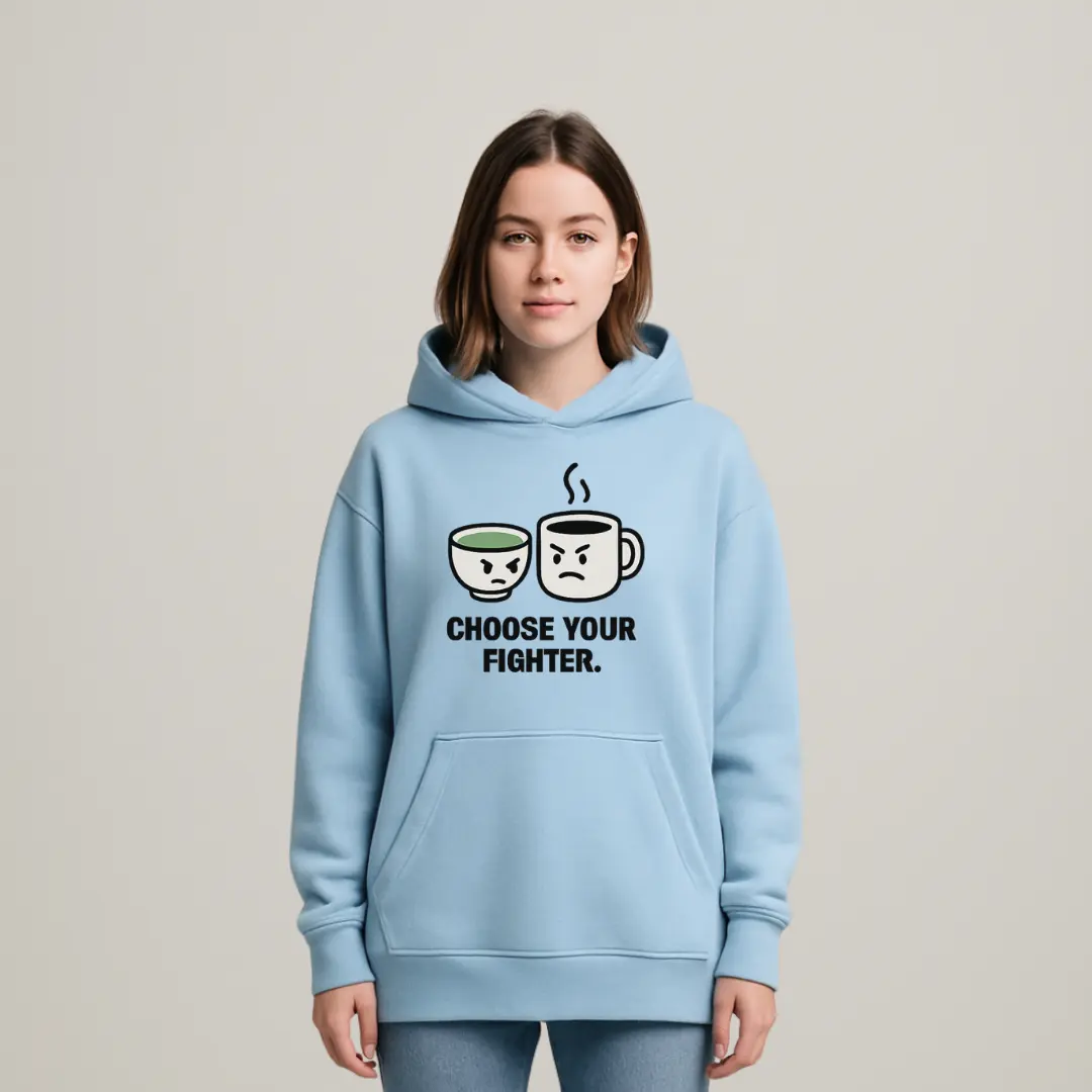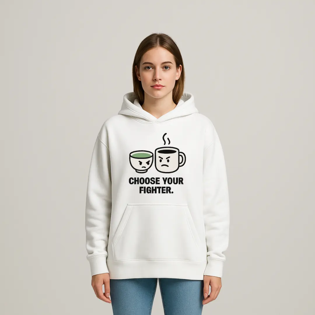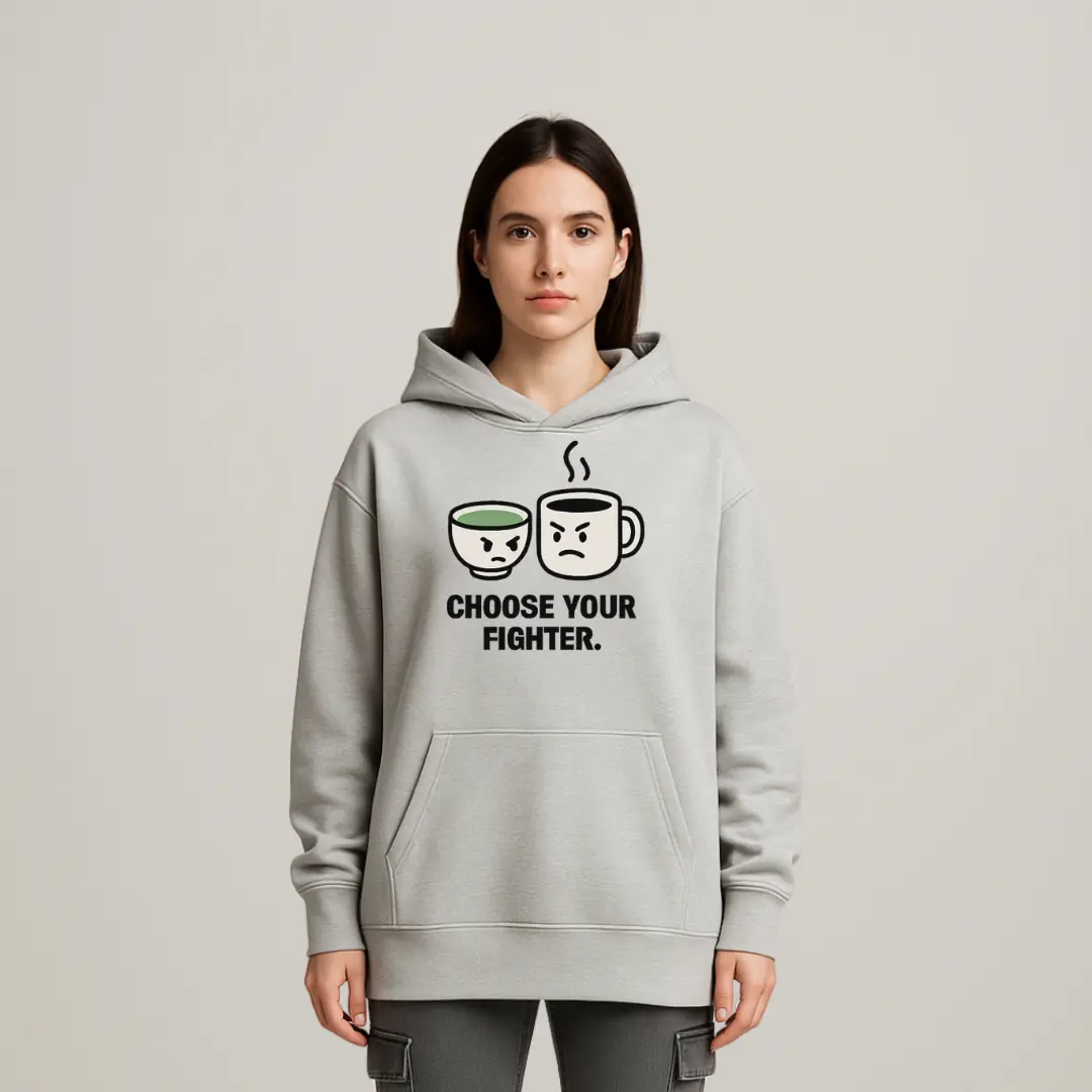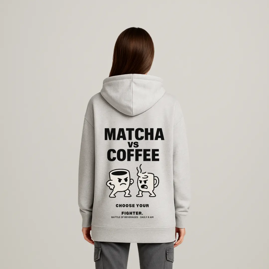 A stylish hoodie featuring a playful coffee versus matcha theme on the back and a coffee and matcha face-off on the front, with a humorous “Choose Your Fighter” slogan.