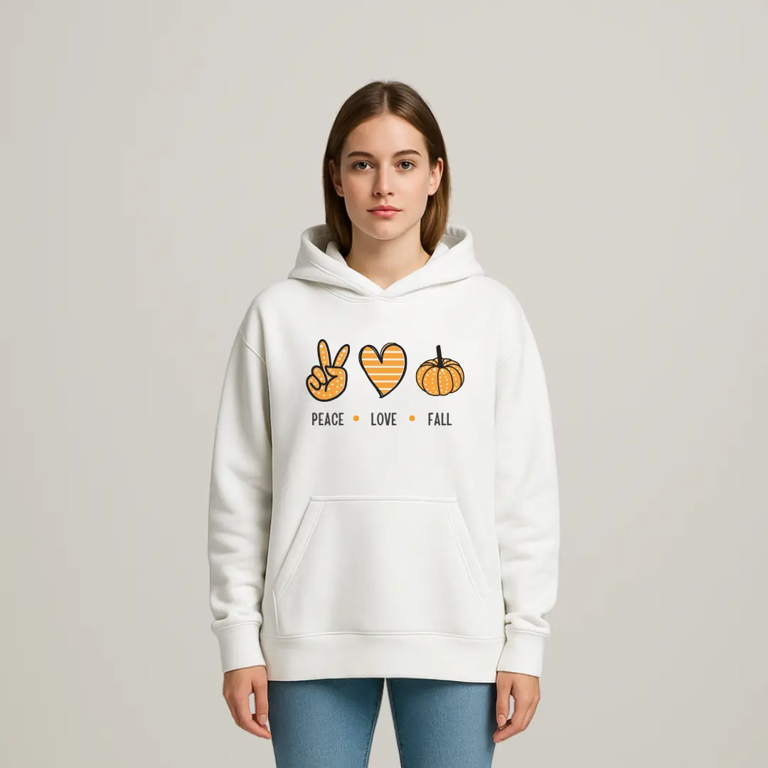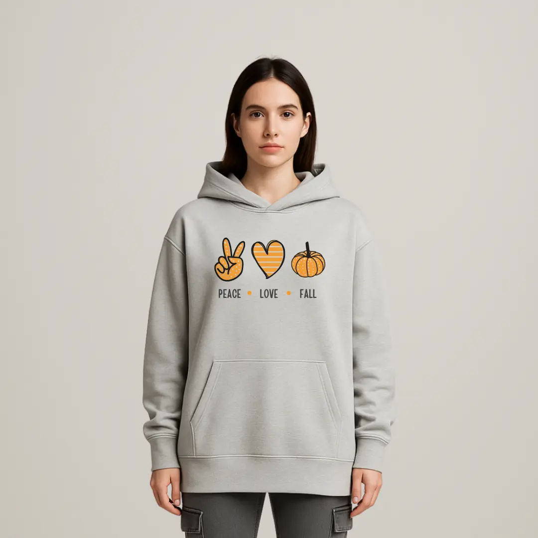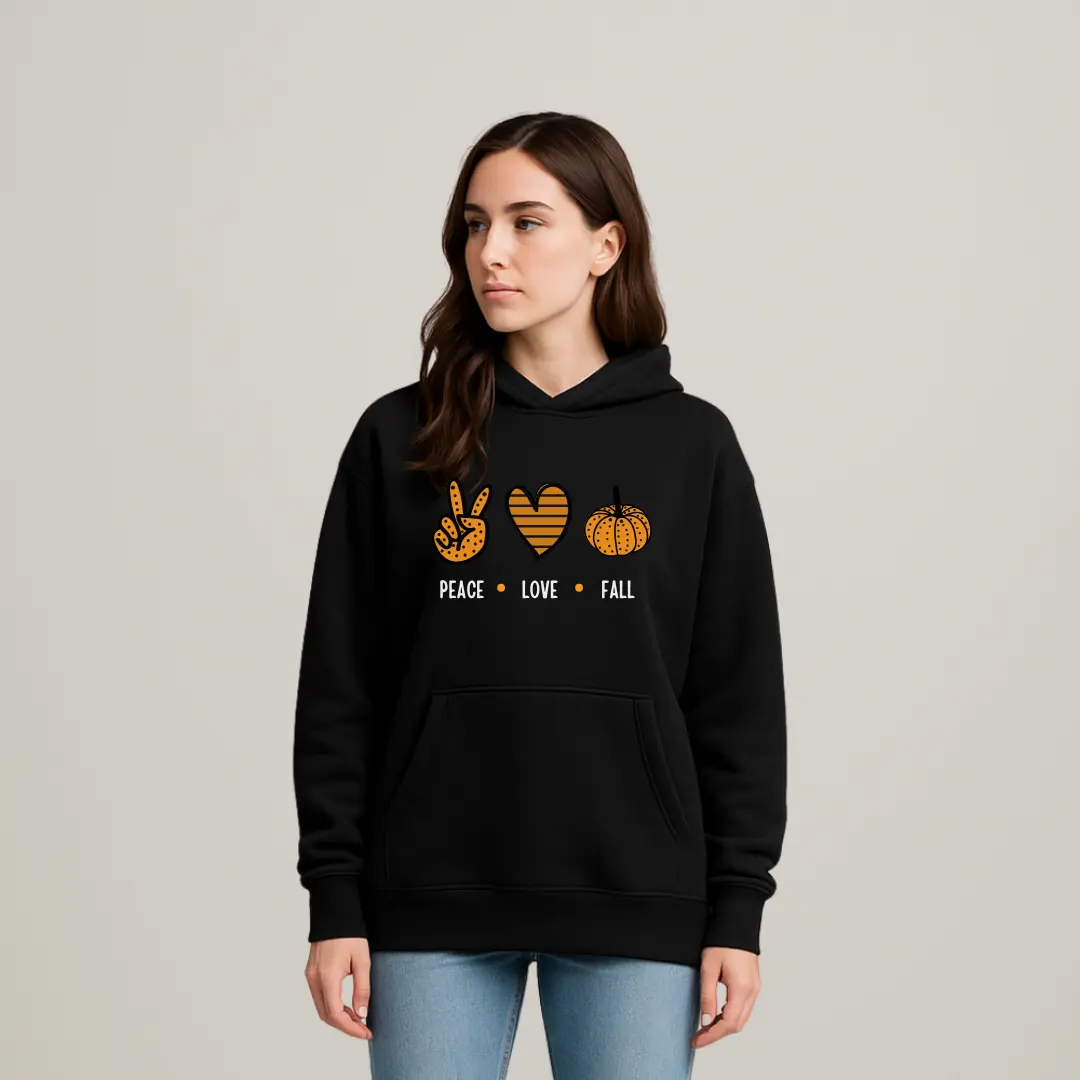 Cozy hoodie with a playful orange “Peace • Love • Fall” graphic — soft fleece, roomy kangaroo pocket, and relaxed fit for seasonal comfort and casual style.