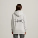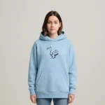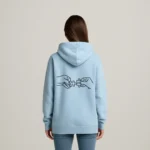 Soft sky-blue hoodie with minimalist black calligraphic graphic and puzzle-motif back — cozy, unisex, and modern.