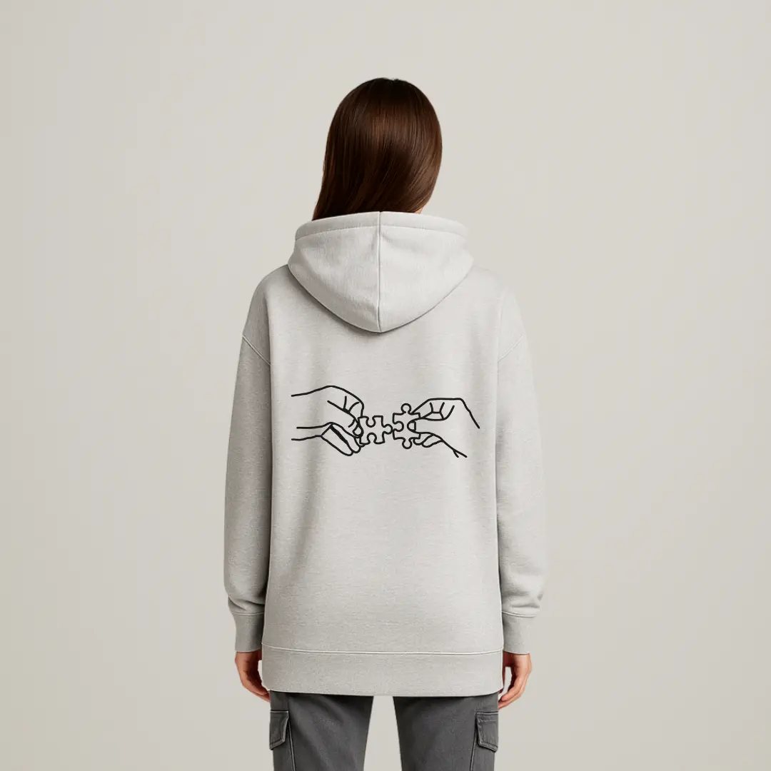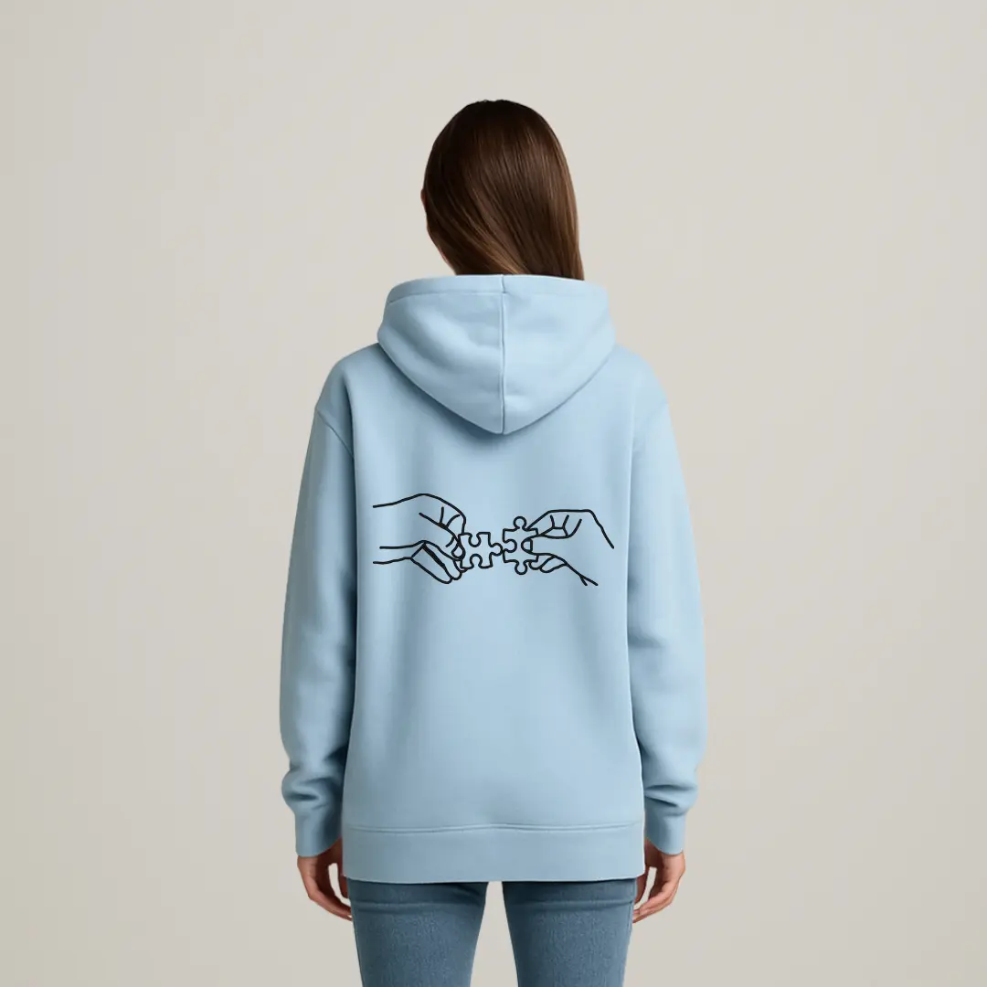Discover effortless style and comfort with this sky-blue unisex hoodie. Crafted from a plush, mid-weight cotton-blend fabric, it offers a relaxed fit, ribbed cuffs and hem, and a roomy kangaroo pocket for everyday ease. The front features a striking minimal black calligraphic design accented by a subtle puzzle-piece element, while the back showcases a complementary line-art illustration of two hands connecting puzzle pieces — a thoughtful symbol of unity and connection. Versatile enough for layering or wearing on its own, this hoodie pairs seamlessly with jeans or joggers and is perfect for casual outings, creative workdays, or cozy evenings. Available in multiple sizes and designed for durable printing with crisp, long-lasting graphics