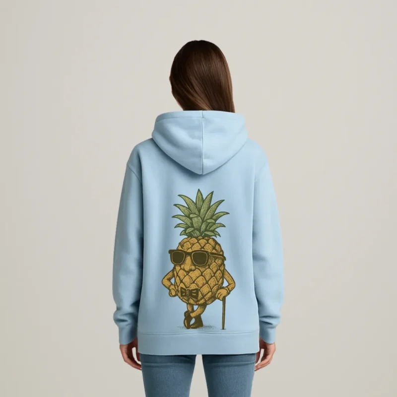 The back features a playful and detailed illustration of a classy pineapple character—complete with sunglasses, a bow tie, and a gentleman’s cane. This creative artwork adds charm and a lighthearted twist, making the hoodie a perfect conversation starter.