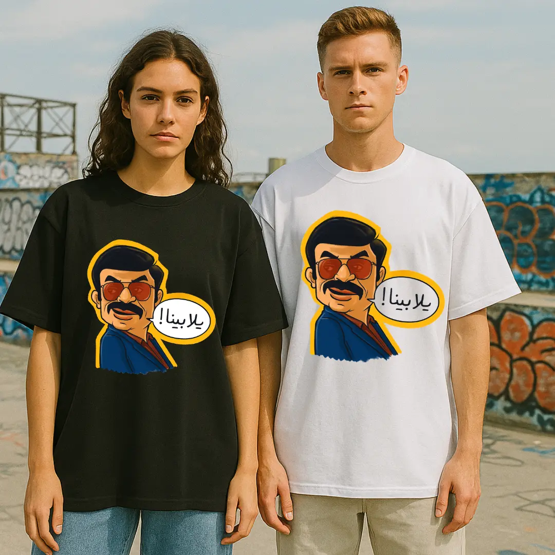 Step into the spotlight with the Yalla Bina! Tee, inspired by Arabic pop culture icons and classic Egyptian charisma. Featuring a cartoon-style character with retro shades and that unmistakable “let’s go!” energy, this shirt captures the vibe of a vintage Egyptian movie hero — charming, slightly sarcastic, and totally unforgettable.